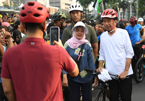 Presiden Joko Widodo (tengah) menerima ajakan swafoto saat berolahraga di hari bebas kendaraan bermotor atau Car Free Day, kawasan Bundaran HI, Jakarta, Minggu (12/5/2024). Foto: Akbar Nugroho Gumay/ANTARA FOTODalam rangkaian hari bebas kendaraan di kawasan Bundaran HI tersebut Jokowi mengenakan sepeda dan sempat menyapa dan berfoto dengan masyarakat sekitar. Foto: Akbar Nugroho Gumay/ANTARA FOTOSelain kehadiran Presiden RI, acara hari bebas kendaraan pun di meriahkan oleh penampilan dari Maliq & D'essential di atas Stasiun MRT Bundaran HI. Foto: Akbar Nugroho Gumay/ANTARA FOTOPenampilan tersebut membuat ribuan orang berkumpul memenuhi kawasan Bundara HI. Foto: Akbar Nugroho Gumay/ANTARA FOTOFoto: Akbar Nugroho Gumay/ANTARA FOTO
