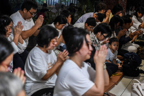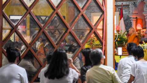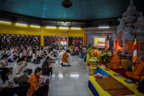 Umat Buddha mengikuti prosesi paritta di Vihara Arya Dwipa Arama, kompleks Taman Mini Indonesia Indah (TMII), Jakarta, Kamis (23/5/2024). Foto: Galih Pradipta/ANTARA FOTO