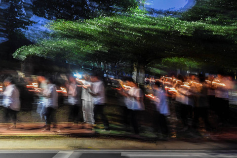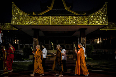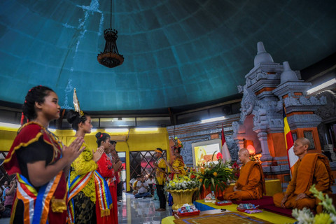 Umat Buddha mengikuti prosesi ibadah pada perayaan Tri suci Waisak tahun 2024/2568 BE di Vihara Arya Dwipa Arama, kompleks Taman Mini Indonesia Indah (TMII), Jakarta, Kamis (23/5).