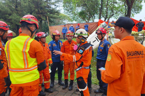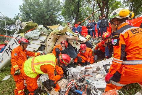 Tim Basarnas Special Gorup (BSG) melakukan evakuasi terhadap 2 korban yang terjepit oleh pesawat latih jenis Tecnam P2006T dengan nomor pesawat PK-IFP yang jatuh di Lapangan Sunburst, BSD, Tangerang Selatan, Minggu (19/5/2024).