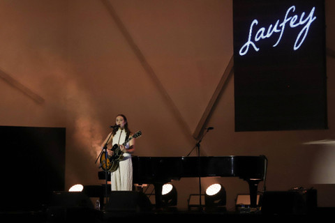 Penonton tampak tertawa mendengar pernyataan Laufey di atas panggung. Kendati demikian di antara mereka ada yang membantu Laufey menyanyikan lirik yang tepat.