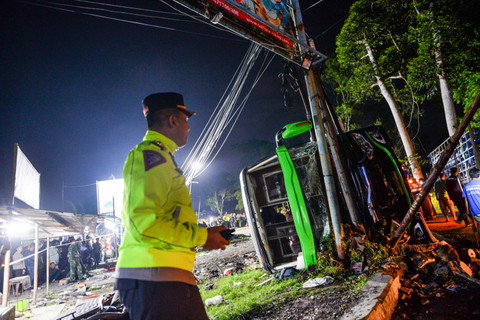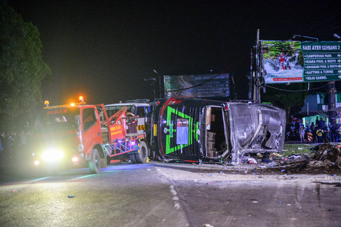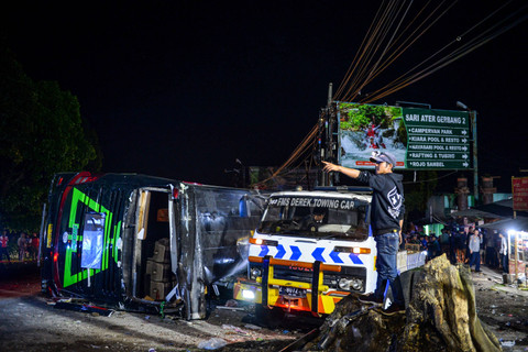 Petugas kepolisian mengevakuasi korban kecelakaan bus pariwisata di Desa Palasari, Kecamatan Ciater, Kabupaten Subang, Jawa Barat, Sabtu (11/5/2024). Foto: Raisan Al Farisi/ANTARA FOTOBus pariwisata rombongan pelajar SMK Lingga Kencana Depok yang mengalami kecelakaan sempat oleng hingga menabrak satu buah mobil dan tiga sepeda motor. Foto: Raisan Al Farisi/ANTARA FOTOKejadian tersebut terjadi sekitar pukul 18.45 WIB dari arah Bandung menuju ke Subang dan menewaskan 11 orang. Foto: Raisan Al Farisi/ANTARA FOTOFoto: Raisan Al Farisi/ANTARA FOTOFoto: Raisan Al Farisi/ANTARA FOTOFoto: Raisan Al Farisi/ANTARA FOTO
