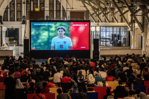 Warga menyaksikan pertandingan Timnas U-23 Indonesia melawan Timnas U-23 Guinea pada pertandingan Playoff Olimpiade Paris 2024 melalui layar tancap di Gedung Filateli Pos Bloc, Jakarta, Kamis (9/5/2024). Foto: ANTARA FOTO/Bayu Pratama S