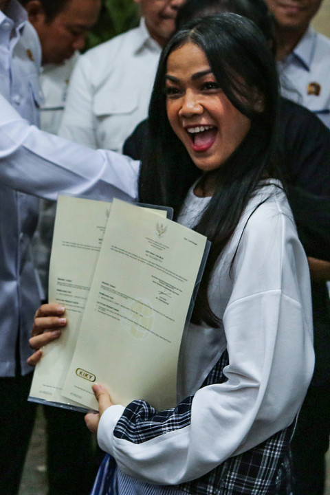 Artis Nirina Zubir menunjukkan sertifikat tanah miliknya setelah diserahkan oleh Menteri Agraria dan Tata Ruang/Kepala Badan Pertanahan Negara (ATR/BPN) Agus Harimurti Yudhoyono di Kantor ATR/BPN, Jakarta, Rabu (29/5/2024). Foto: ANTARA FOTO/Asprilla Dwi Adha