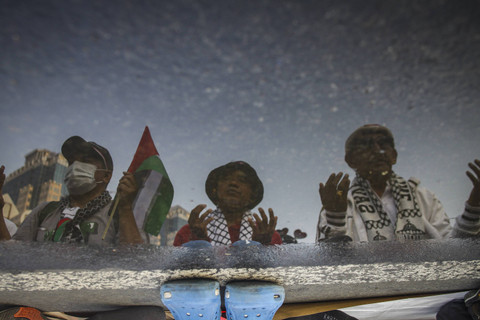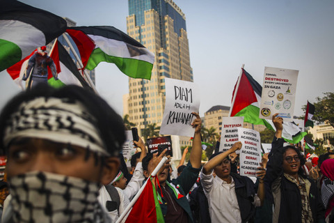 Berbagai kalangan tampak mengikuti aksi itu. Mereka datang dengan membawa atribut bernuansa dukungan terhadap Palestina.