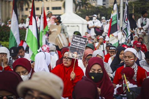 Mereka yang datang dengan pakaian merah-putih-hitam itu terlihat kompak mengibarkan bendera Palestina. Bersama dengan itu, massa juga mengibarkan bendera Indonesia.