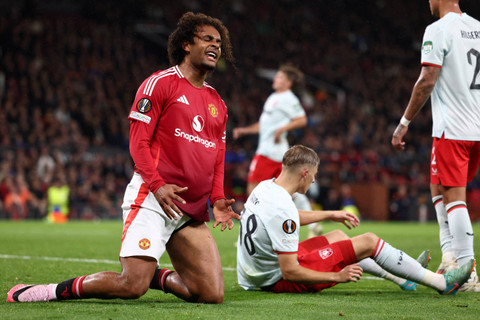 Selebrasi pemain FC Twente usai mencetak gol ke gawang Manchester United pada pertandingan Liga Europa di Old Trafford, Manchester, Inggris, Rabu (25/9/2024). Foto: Darren Staples / AFP