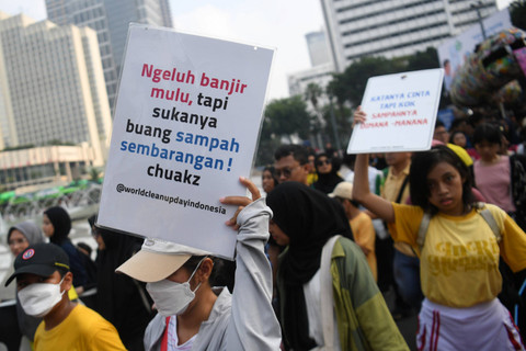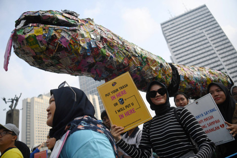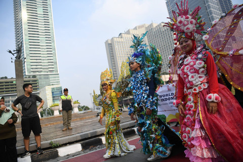 Relawan dari World Clean Up Indonesia menggelar aksi kampanye lingkungan saat car free day (CFD), Jakarta, Minggu (22/9). Foto: Akbar Nugroho Gumay/ANTARA FOTODalam aksinya, mereka membawa papan imbauan menjaga lingkungan, tidak buang sampah sembarangan, hingga peragaan busana yang terbuat dari sampah plastik dan boneka ular raksasa yang terbuat dari sampah juga. Foto: Akbar Nugroho Gumay/ANTARA FOTOKampanye ini bertujuan untuk mengajak masyarakat agar menjaga lingkungan dari sampah plastik dan sampah ilegal lainnya yang dapat merusak lingkungan. Foto: Akbar Nugroho Gumay/ANTARA FOTOFoto: Akbar Nugroho Gumay/ANTARA FOTO