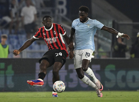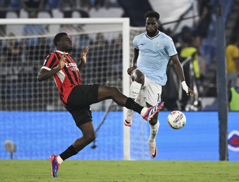 Strahinja Pavlovic dari AC Milan beraksi dengan pemain Lazio, Loum Tchaouna pada laga Serie A saat Lazio melawan AC Milan di Stadio Olimpico, Roma, Italia, Sabtu (31/8/2024). Foto: Alberto Lingria/REUTERS