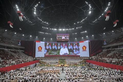Ketua Umum Partai Gerindra sekaligus presiden terpilih Prabowo Subianto menyampaikan sambutan saat acara Penutupan Rapat Pimpinan Nasional (Rapimnas) Partai Gerindra di Indonesia Arena, GBK, Senayan, Jakarta, Sabtu (31/8/2024). Foto: Fauzan/ANTARA FOTO