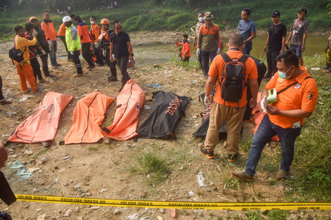 Petugas mengevakuasi tujuh jenazah laki laki yang ditemukan mengambang di Kali Bekasi, Pondok Gede Permai, Jatiasih, Kota Bekasi, Minggu (22/9/2024). Foto: Rezas Ale/ANTARA FOTO