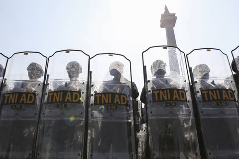 Prajurit TNI dan Polri melaksanakan apel gelar Pengamanan VVIP dalam rangka pelantikan presiden dan wakil presiden di Monas, Jakarta, Jumat (18/10).