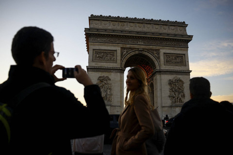 Menikmati keindahan menjelang matahari terbenam menjadi daya tarik warga serta turis yang berkunjung ke dua monumen sekaligus ikon kota Paris, yakni Menara Eiffel dan Arc de Triomphe. Terlihat para turis berfoto dan menikmati keindahan menjelang matahari terbenam.