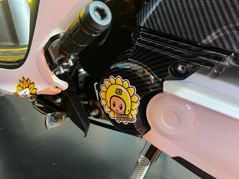 Perpaduan warnanya bikin motor miliknya jadi kalcer. Di bagian body ada juga desain logo bunga matahari dengan topi pelaut yang khas seperti gaya Vijie.