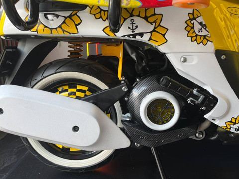 Vijie juga melapis beberapa bagian motornya dengan karbon kevlar seperti di bagian CVT hingga bagian cover filter. Bagian velgnya dibikin leblih kalcer dengan penambahan wheeldop di bagian depan dan belakang.