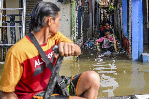 Anak-anak bermain saat banjir melanda Kampung Bojongasih, Dayeuhkolot, Kabupaten Bandung, Jawa Barat, Minggu (24/11/2024). Foto: Raisan Al Farisi/ANTARA FOTOMenurut data dari petugas Desa Dayeuhkolot mencatat sebanyak 3.800 jiwa terdampak bencana banjir akibat luapan Sungai Citarum setinggi 50 hingga 150 cm. Foto: Raisan Al Farisi/ANTARA FOTOSementara di posko pengungsian, hingga saat ini tercatat sebanyak 46 warga masih berada di posko sedangkan sisanya memilih untuk kembali ke rumahnya yang masih terendam banjir. Foto: Raisan Al Farisi/ANTARA FOTOFoto: Raisan Al Farisi/ANTARA FOTOFoto: Raisan Al Farisi/ANTARA FOTO