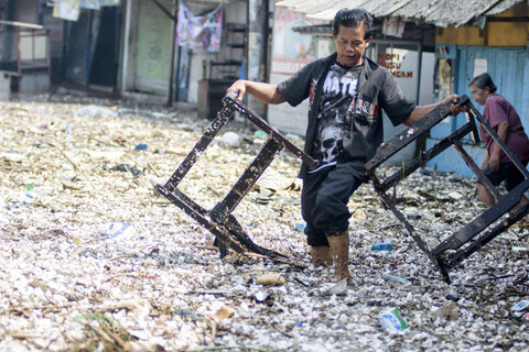 Akibat banjir tersebut terdapat tumpukan sampah yang terbawa arus hingga sepanjang 15 meter lebih.