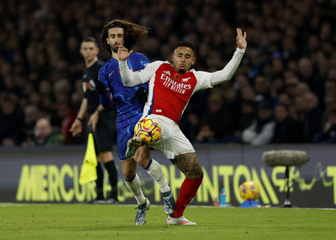 Pemain Chelsea Christopher Nkunku beraksi dengan pemain Arsenal Gabriel Magalhaes pada pertandingan Liga Inggris antara Chelsea melawan Arsenal di Stamford Bridge, London, Inggris, Minggu (10/11/2024) malam. Foto: Peter Cziborra/REUTERS