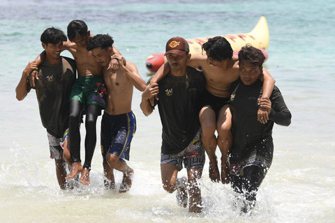 Menjelang libur panjang Natal dan Tahun Baru pada Desember mendatang, dipastikan jumlah wisatawan di tempat objek wisata akan mengalami peningkatan. Salah satunya wisata pesisir yang meliputi wilayah pantai mulai dari wahana air hingga renang permukaan (snorkling). Foto: Muhammad Adimaja/Antara FotoSelain Ancol, objek wisata pesisir di kawasan Kepulauan Seribu juga diminati masyarakat di wilayah Jakarta. Banyak pulau yang dituju pada kawasan tersebut seperti Pulau Harapan, Pulau Pramuka dan Pulau Tidung. Foto: Muhammad Adimaja/Antara FotoGuna mengantisipasi antusias masyarakat pada kawasan di Kepulauan Seribu tersebut, maka kehadiran penjaga pantai atau lifeguard diperlukan untuk menjaga wisatawan dari potensi bahaya. Foto: Muhammad Adimaja/Antara FotoNamun menurut keterangan Ketua Daerah Perlindungan Laut - Basis Masyarakat (DPL-BM) Lestari indah Pulau Tidung Lah Mudin, wilayah Kepulauan Seribu belum ada penjaga pantai yang berkompeten atau tersertifikasi. Foto: Muhammad Adimaja/Antara FotoSehingga, kejadian korban meninggal akibat tenggelam kerap terjadi lantaran tidak sesuai dengan prosedur penanganan korban tenggelam, kata pria yang biasa disapa Limbad. Foto: Muhammad Adimaja/Antara FotoMendengar kata penjaga pantai mungkin yang akan terlintas adalah film 'Baywatch', sebuah seri tayangan seri yang pernah mengudara di Indonesia pertama kali pada tahun 1989, dan kembali dibuat film layar lebarnya pada 2017 yang dibintangi oleh Dwayne Johnson alias The Rock, yang menceritakan kegiatan para penjaga pantai di negeri paman sam itu. Foto: Muhammad Adimaja/Antara FotoTidak jauh berbeda sebenarnya dengan beberapa adegan dalam film itu, mulai dari breafing awal sebelum memulai latihan dan berkegiatan, pembagian tim dari peserta, dimana setiap tim akan didampingi oleh instruktur atau pelatih, beberapa latihan fisik seperti renang permukaan, renang bawah air (renang apnea). Foto: Muhammad Adimaja/Antara FotoSetiap peserta akan mendapatkan materi seperti mengidentifikasi potensi bahaya, melakukan supervisi keselamatan pengunjung, pengenalan dan pengunaan alat penyelamatan seperti pelampung penyelamat (rescue tube), papan penyelamat (surf rescue board), penyelamatan tanpa alat, melakukan pertolongan pertama (first aid), serta melakukan Cardiopulmonary resuscitation (CPR). Foto: Muhammad Adimaja/Antara FotoDengan segala materi serta praktek yang didapatkan dari pelatihan tersebut maka peserta akan mendapatkan sertifikat penjaga pantai level 3, sehingga faktor keselamatan bagi para wisatawan lebih baik dan mengurangi angka kecelakaan saat berwisata air, dan para wisatawan dapat bermain dengan rasa aman dan nyaman berwisata ke Pulau Tidung. Foto: Muhammad Adimaja/Antara FotoPara penjaga pantai Pulau Tidung pun berharap agar pemerintah melalui Kemenpar, agar dapat membantu memfasilitasi sarana bagi penjaga pantai seperti pos pantau, seragam penjaga pantai serta alat penyelamat. Foto: Muhammad Adimaja/Antara Foto"Selain itu kita berharap, karena sudah terferifikasi semoga pemerintah melalui Kemenpar bisa turut membantu, membangun pos pantau di beberapa titik pantai dan juga seragam, sehingga pengunjung atau wisatawan tahu kalua yang menolong adalah penjaga pantai kayak di Ancol gitu," pungkas Limbad. Foto: Muhammad Adimaja/Antara Foto