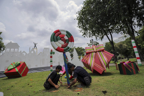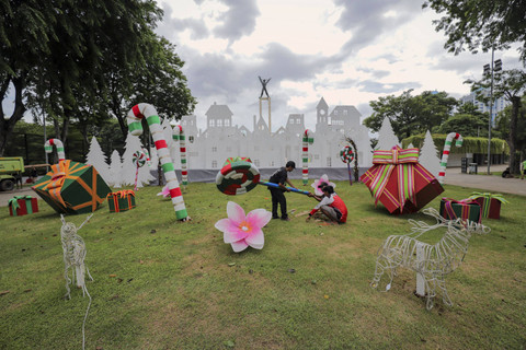 Foto: Kesibukan Pekerja Menyiapkan Dekorasi Natal di Lapangan Banteng - my blog