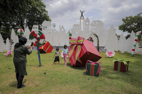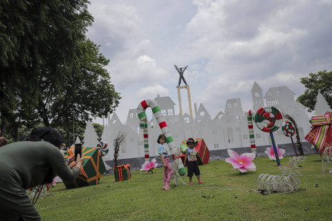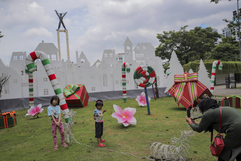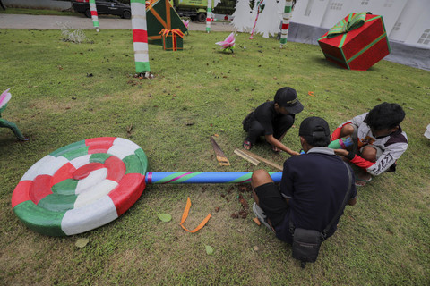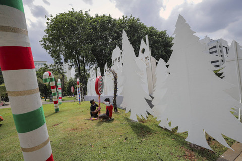 Pekerja menyelesaikan dekorasi nuansa Natal di Taman Lapangan Banteng, Sawah Besar, Jakarta Pusat, Jumat (20/12).