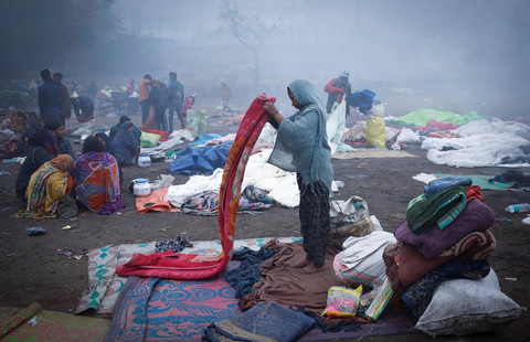 Orang-orang duduk di samping api unggun di lapangan terbuka pada pagi musim dingin yang berkabut di kawasan tua Delhi, India, 3 Januari 2025. Foto: REUTERS/Adnan Abidi