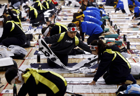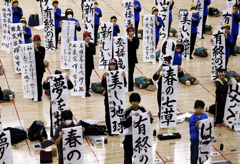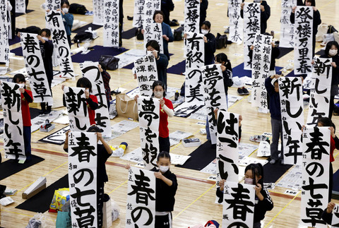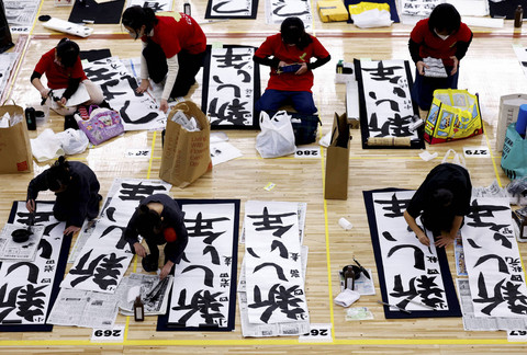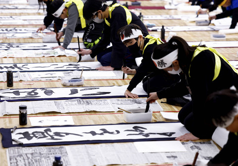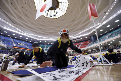 Para peserta mengikuti kontes kaligrafi Tahun Baru di Nippon Budokan di Tokyo, Jepang, Minggu (5/1/2025).
