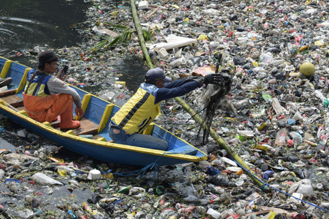 Petugas kebersihan mengambil sampah yang menumpuk di Sungai Citarum Lama, di Cicukang, Margaasih, Kabupaten Bandung, Jawa Barat, Senin (27/1/2025). Foto: Raisan Al Farisi/ANTARA FOTO