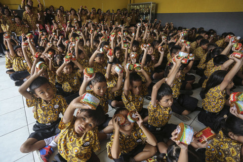 Sejumlah siswa mengangkat kue usai dibagikan saat mengikuti tradisi berbagai kue keranjang di Sekolah Kuncup Melati, Semarang, Jawa Tengah, Selasa (21/1/2025). Foto: Makna Zaezar/ANTARA FOTOTradisi tahunan yang diadakan oleh Yayasan Khong Kauw Hwee di sekolah gratis Kuncup Melati tersebut bertujuan melestarikan tradisi warga etnis Tionghoa yakni saling berbagi kue keranjang. Foto: Makna Zaezar/ANTARA FOTOHal tersebut dilakukan untuk menyambut perayaan Tahun Baru Imlek sekaligus mengajarkan kepada para pelajar tentang toleransi antar umat manusia yang harus saling membantu dan menghormati serta bergotong royong. Foto: Makna Zaezar/ANTARA FOTOFoto: Makna Zaezar/ANTARA FOTO