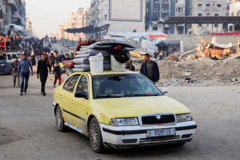 Tampak warga yang mengungsi kembali membawa barang-barang berharga mereka dengan menggunakan mobil, gerobak, bahkan jalan kaki melewati puing-puing bangunan yang hancur imbas serangan Israel.