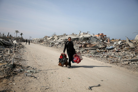 Warga Palestina yang mengungsi membawa barang-barangnya saat berjalan melewati puing-puing mencoba kembali ke rumah menyusul dimulainya gencatan senjata di Rafah, Jalur Gaza, Minggu (19/1/2025). Foto: Hatem Khaled/REUTERS