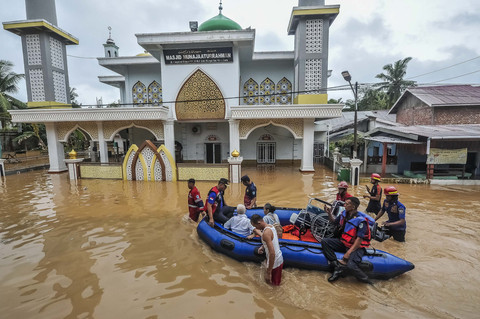 Petugas Dinas Pemadam Kebakaran dan Penyelamatan (Damkartan) Kota Jambi mengevakuasi lansia yang terjebak banjir di Suka Karya, Jambi, Minggu (23/2/2025). Foto: Wahdi Septiawan/ANTARA FOTOSejumlah lansia dan anak-anak di kawasan tersebut dievakuasi oleh petugas ke tempat yang lebih aman. Foto: Wahdi Septiawan/ANTARA FOTOAdapun puluhan rumah dan sekolah terendam banjir akibat luapan Sungai Kenali Asam setelah diguyur hujan lebat pada Minggu (23/2) dini hari. Foto: Wahdi Septiawan/ANTARA FOTOFoto: Wahdi Septiawan/ANTARA FOTO
