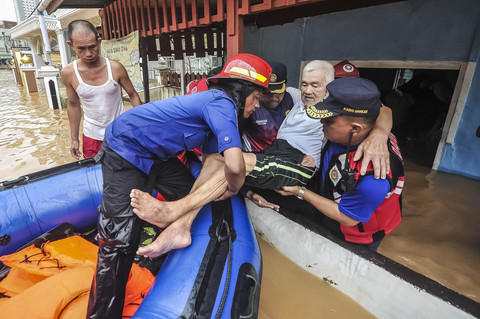 Petugas Dinas Pemadam Kebakaran dan Penyelamatan (Damkartan) Kota Jambi mengevakuasi lansia yang terjebak banjir di Suka Karya, Jambi, Minggu (23/2/2025).
