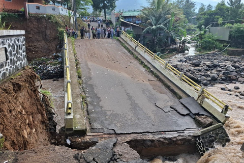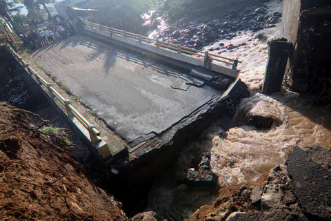 Jembatan penghubung Desa Leuwimalang dan Desa Jogjogan ambles akibat meluapnya sungai Ciliwung di Cisarua, Kabupaten Bogor, Senin (3/3). Jembatan ini juga merupakan akses menuju wista Curug Cilember. Foto: Yulius Satria Wijaya/ANTARA FOTOAkibat putusnya jembatan tersebut, pengendara motor dan mobil tidak melintas. Untuk beraktivitas, warga menggunalan jalan alternatif yang memakan waku tempuh. Foto: Yulius Satria Wijaya/ANTARA FOTOHujan lebat yang mengguyur wilayah tersebut sejak siang kemarin menyebabkan air sungai meluap dan mengakibatkan jembatan ambles. Foto: kumparanFoto: kumparan