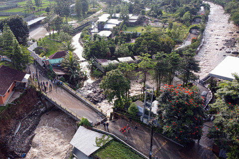 Foto udara kondisi jembatan Ciliwung yang putus akibat meluapnya sungai Ciliwung di Desa Jogjogan, Cisarua, Kabupaten Bogor, Jawa Barat, Senin (3/3/2025). Foto: Yulius Satria Wijaya/ANTARA FOTO