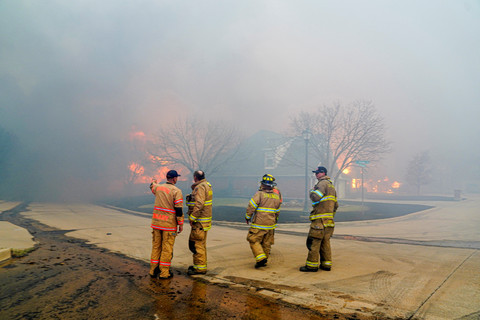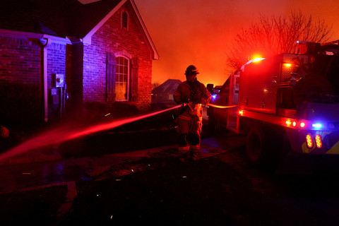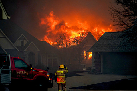 Petugas pemadam kebakaran berusaha memadamkan api yang membakar rumah penduduk akibat kebakaran hutan yang meluas di kawasan Stillwater, Oklahoma, AS, Jumat 14 Maret 2025.