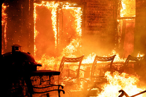 Kebakaran menghanguskan sebuah rumah selama kebakaran hutan di Stillwater, Oklahoma, AS, 14 Maret 2025. Foto: REUTERS/Nick Oxford