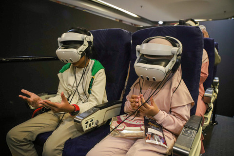 Pengunjung menggunakan perangkat Virtual Reality (VR) saat simulasi haji dan umroh di arena Manasik Xperience di Kuningan City Mall, Jakarta, Sabtu (8/3/2025). Foto: Iqbal Firdaus/kumparan