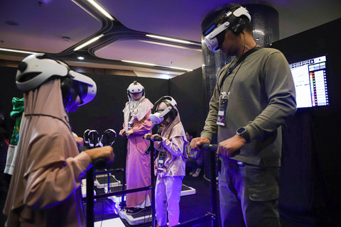 Pengunjung menggunakan perangkat Virtual Reality (VR) saat simulasi haji dan umrah di arena Manasik Xperience di Kuningan City Mall, Jakarta, Sabtu (8/3/2025).