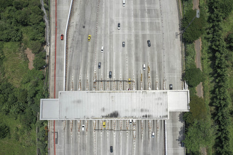 Foto udara sejumlah kendaraan melintasi Gerbang Tol Cikampek Utama, Karawang, Jawa Barat, Minggu (30/3/2025). Foto: Fauzan/ANTARA FOTO