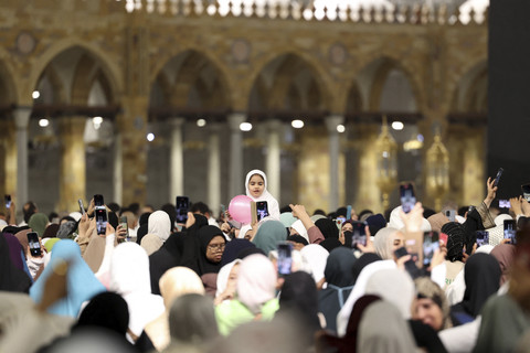 Umat Muslim melaksanakan salat subuh di Masjidil Haram di kota suci Makkah, Arab Saudi, pada awal Idul Fitri, yang menandai berakhirnya bulan puasa Ramadan, Minggu (30/3/2025).