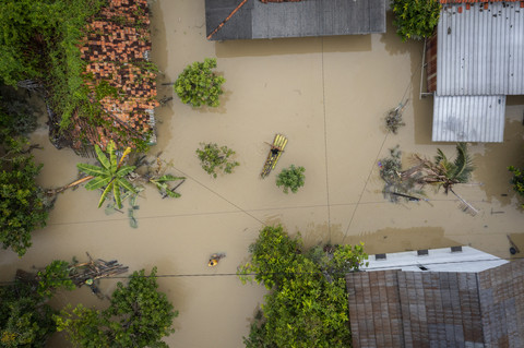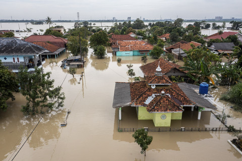 Foto udara suasana permukiman warga yang terendam banjir di Kalangligar, Telukjambe, Karawang, Jawa Barat, Jumat (7/3/2025). Foto: Bayu Pratama S/ANTARA FOTO