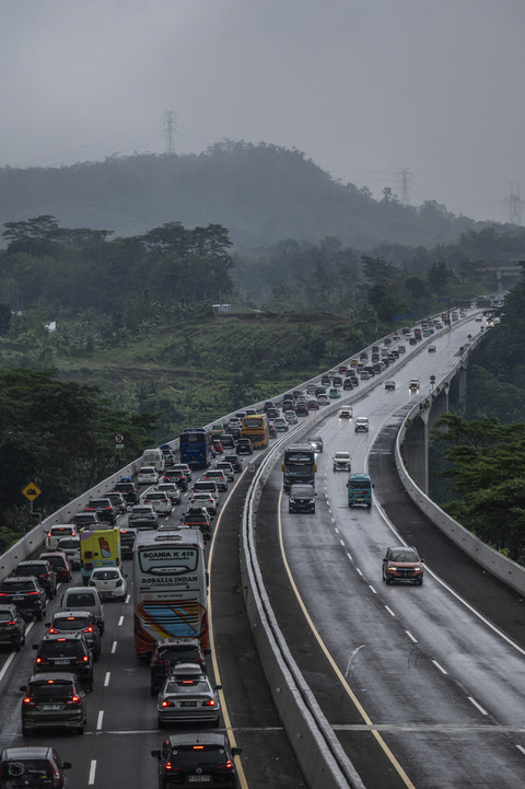 Sejumlah kendaraan (lajur kanan) melaju perlahan menuju arah Jakarta di Tol Trans Jawa ruas Semarang-Solo, Bawen, Kabupaten Semarang, Jawa Tengah, Jumat (4/4/2025). Foto: Aprillio Akbar/ANTARA FOTO