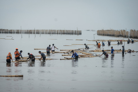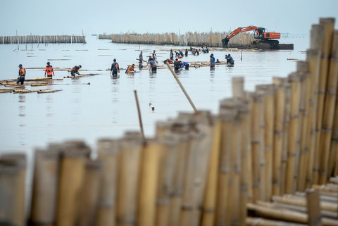 Petugas gabungan bersama nelayan mengumpulkan bambu dari pembongkaran pagar laut di pesisir laut Desa Kohod, Kabupaten Tangerang, Banten, Kamis (17/4/2025). Foto: ANTARA FOTO/Putra M. AkbarFoto udara pekerja menggunakan alat berat saat membongkar pagar laut di pesisir laut Desa Kohod, Kabupaten Tangerang, Banten, Kamis (17/4/2025). Foto: ANTARA FOTO/Putra M. AkbarFoto: ANTARA FOTO/Putra M. AkbarFoto: ANTARA FOTO/Fakhri Hermansyah