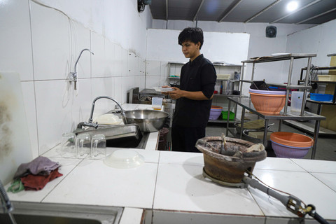 Tak ada aktivitas memasak di dapur milik Ira Mesra Destiwati itu. Alat masak di dapur tersebut sudah dirapikan. Kondisi sepi juga tampak terlihat di area dan kawasan dapur.