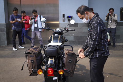 Petugas KPK menunjukkan motor Royal Enfield Classic 500 Limited Edition milik mantan Gubernur Jawa Barat, Ridwan Kamil di Rumah Penyimpanan Benda Sitaan Negara (Rupbasan) KPK, Jakarta, Jumat (25/4).