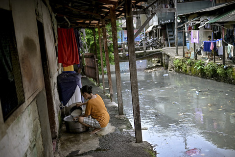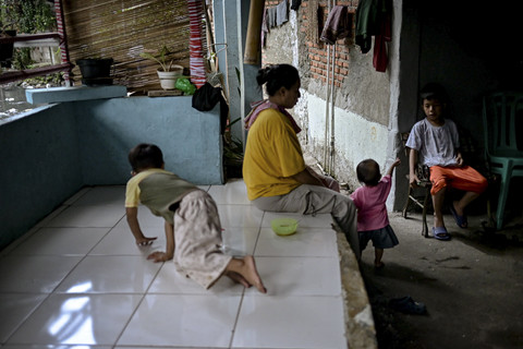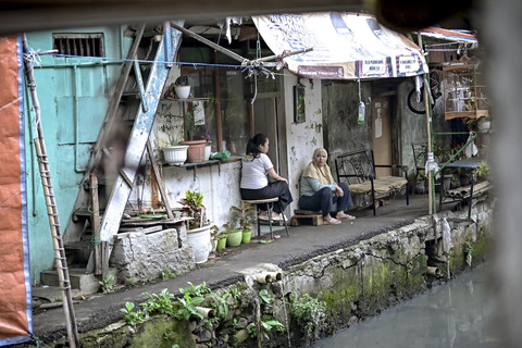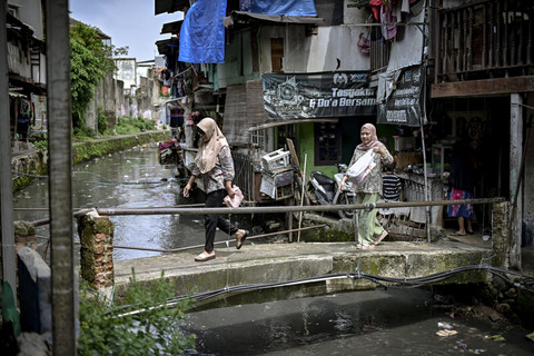 Warga beraktivitas di kawasan pemukiman padat penduduk, kawasan Tanah Abang, Jakarta, Minggu (13/4/2025).