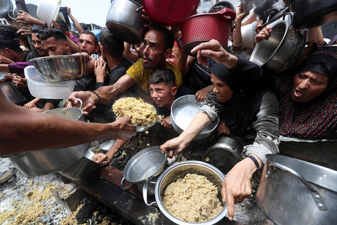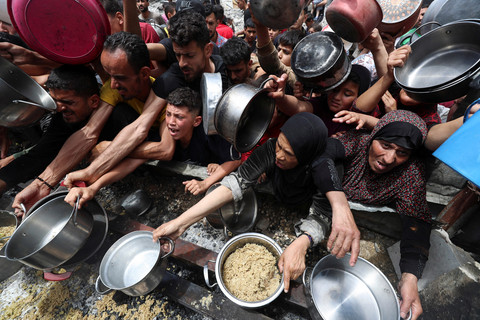 Warga Palestina menunggu untuk menerima makanan yang dimasak oleh dapur amal, di Jabalia, di Jalur Gaza utara, 14 Mei 2025. Foto: REUTERS/Mahmoud Issa