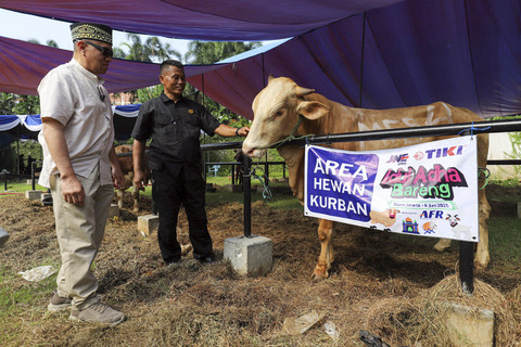 Direktur Utama TIKI, Yulina Hastuti tampak berbincang dengan panitia pelaksana kegiatan 'TIKI-JNE Idul Adha Bareng' yang sedang sibuk mempersiapkan pembagian daging kurban.